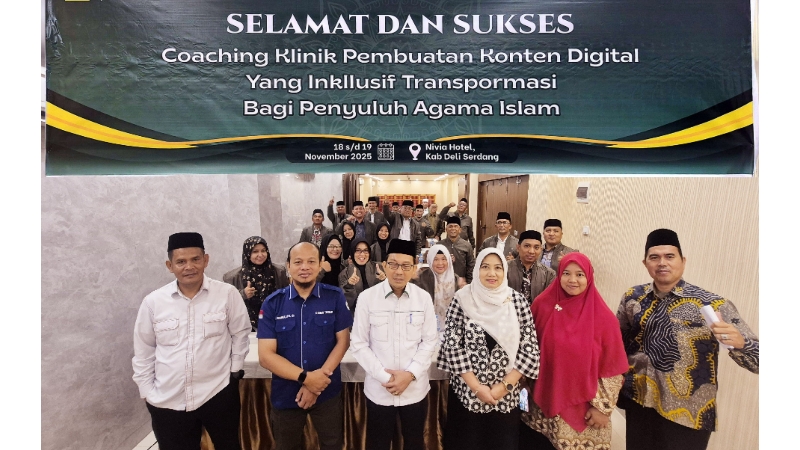 Medan — Kementerian Agama Provinsi Sumatera Utara melalui Bidang Penerangan Agama Islam dan Zakat Wakaf (Penais Zawa) menggelar Coaching Klinik Pembuatan Konten Digital yang Inklusif dan Transformatif bagi Penyuluh Agama Islam. Kegiatan ini berlangsung di Nivia Hotel Medan pada 18–19 November 2025 dan diikuti oleh para penyuluh agama Islam pilihan dari berbagai daerah di Sumatera Utara.