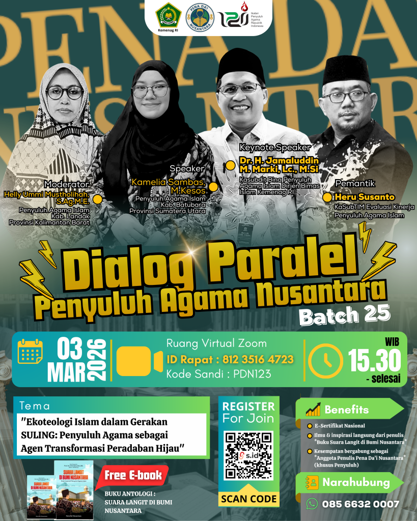 Kegiatan Dialog Paralel Penyuluh Agama Nusantara Batch 25 dilaksanakan pada Selasa, 03 Maret 2026, pukul 15.30 WIB sampai selesai melalui ruang virtual Zoom Meeting. Kegiatan ini mengangkat tema *“Ekoteologi Islam dalam Gerakan SULING: Penyuluh Agama sebagai Agen Transformasi Peradaban Hijau.”*